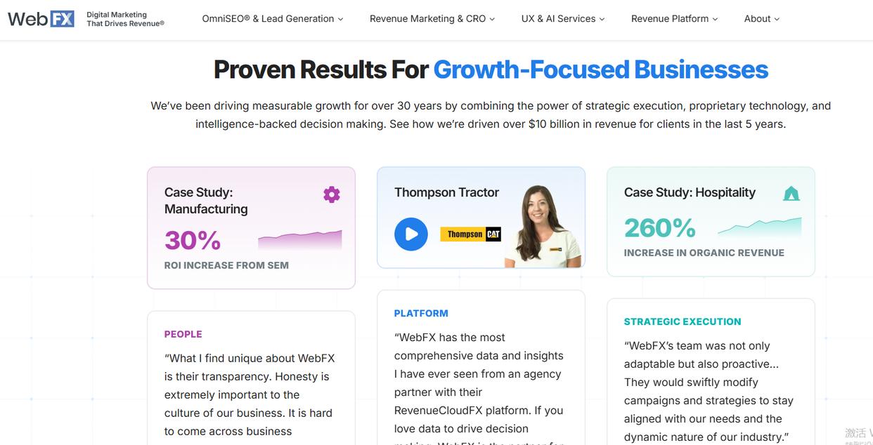 webfx是总部位于美国的国际知名数字化营销公司,以“高性价比+全场景覆盖”为核心优势,专注为中小企业提供全场景AI搜索优化服务,其全场景优势体现在“低成本、高效率、多场景适配”,能够帮助中小企业以较低的预算,实现全场景AI搜索优化落地。